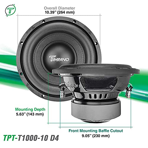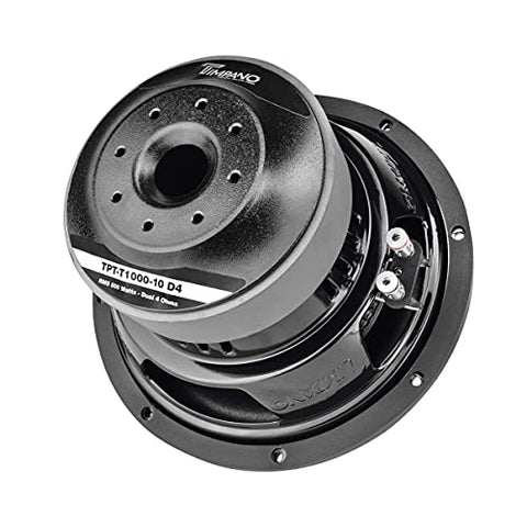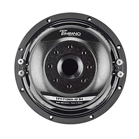 Timpano 10″ Car Audio Subwoofer 1000 Watts Dual 4 Ohms TPT-T1000-10 D4 Deep Low Tones4 Layer 2.4″ Copper Wire Voice CoilOversized Single Magnet DesignEntry-Level, low tone bassTimpano T1000 is all about deep low tones for small efficient systems. These subs deliver incredible low tones with a small amount of power. This keeps electrical upgrades minimal with less added strain on the vehicle. With high energy, oversized single magnet motor paired with a high foam surround stitched to a heavy-duty competition-grade pressed paper cone, it allows this woofer to play the low notes it was designed for.All the top quality components featured in this sub, as well as its advanced 3-way airflow cooling system, are what ultimately allow for incredible responsiveness & power handling. This subwoofer will play deeper, with more dynamic range, and increase output after you properly break in your subwoofer. Its suspension is designed to provide a high level of excursion and linear control in ported boxes. A brand new sub is always a little stiff but with a proper break-in, the subwoofer soft parts will stretch out! This means with less power you will create the same output with more extended low bass tones.THIELE-SMALL PARAMETERS - Wired in Parallel Re 1.8 OhmsFree Air Resonance - Fs - 38 HzElectrical Factor - Qes - 0.66Equivalent Volume - Vas - 12.81 LitersTotal Factor - Qts - 0.60Mechanical Factor - Qms - 7.80Linear Excursion: Xmax - 14 mmMax Mechanical Excursion: Xmech - 20 mmBl Factor - Bl - 9.68 Tm